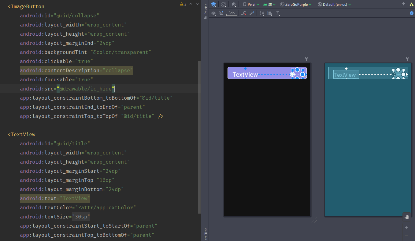看代码其实很简单,所有有关Constraint的组件都以app:xxx的形式出现在组件属性里,你需要在xml最上面引用